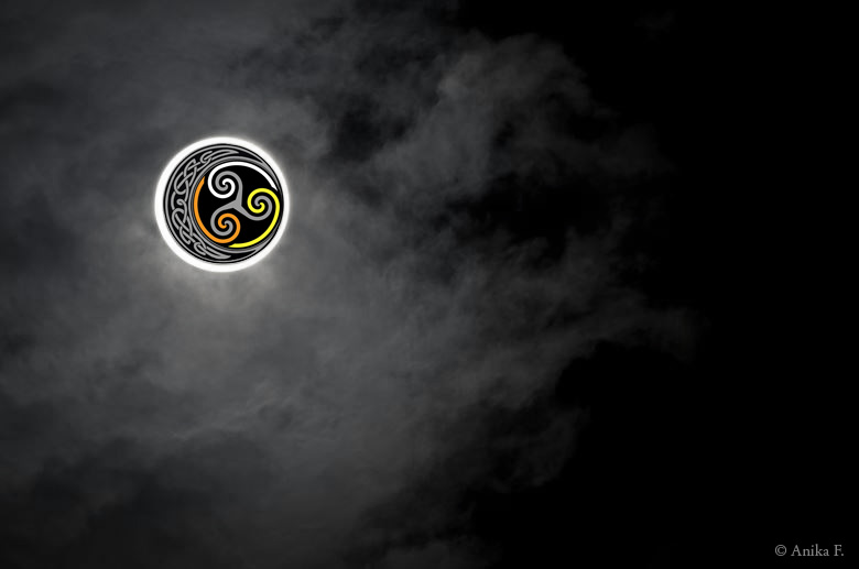 Die Sonne ist nur noch schwach am äußersten Rand zu sehen (orange). Der Mond hat sie fast verdeckt (Sonnenfinsternis). Im Schatten des Mondes ist ein Baum zu sehen (Mondbaum) der sich als Mondsichel formt und das Triskele in den Farben gelb, weiß und orange umspannt.